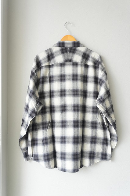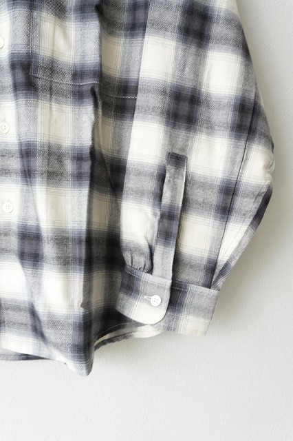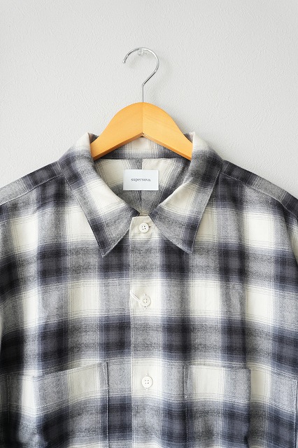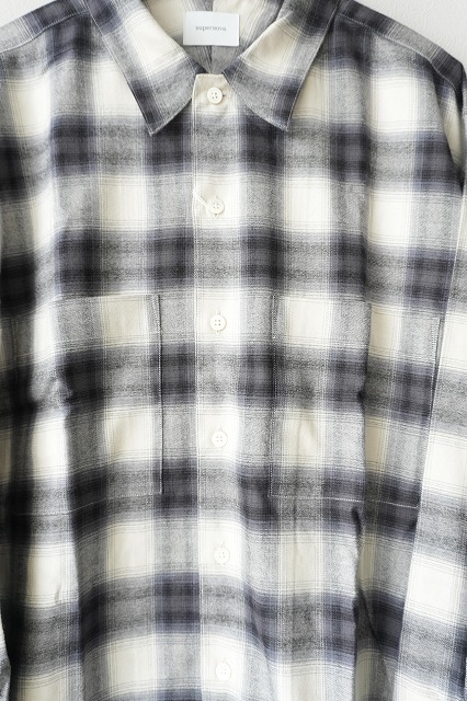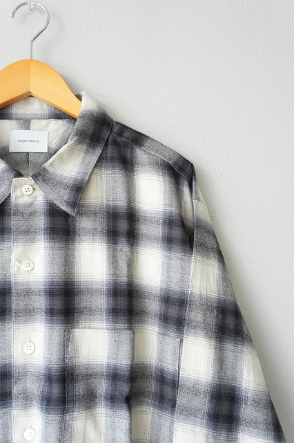 Split yoke big shirt - Ombre check SN-584 コットンレーヨンを使用し織られたオンブレーチェックネル地で製作した ビッグシャツです。 袖も太めに設定しており、ロンTや、薄手のニットの上に羽織としてもご着用いただけます。 ボタンは貝ボタンを使用しております。 サイズ M 着丈 77cm 身幅 65cm 袖丈 59cm 肩幅 55cm 素材 コットン58%、レーヨン42% superNova.【スーパーノヴァ】 カラー Gray x Natural サイズ M 在庫状態 : 売り切れ ¥27,500(税込) 只今お取扱い出来ません 数量