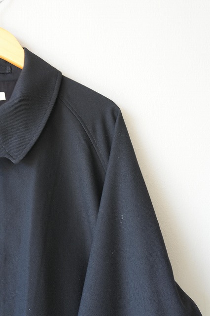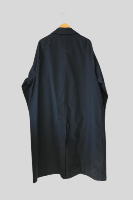 ⾝幅・着丈ともにたっぷりと⼨法を取りつつ、Aラインを強調したシルエットのシングルラグランコートをベースに、ハンドウォームポケットの位