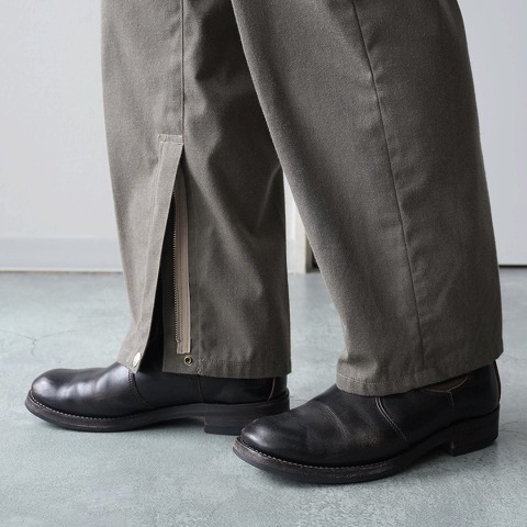 C/W AVIATOR SLACKS PMAU-PT01 縦糸にウール、緯糸にコットンを使用して制作したオリジナルギャバジン素材。 タテヨコで色差をつけることで奥行きのある表情になっています。 両面ピーチ起毛。 裾に配置したファスナーが特徴。 サイズ 1 ウエスト 78cm 股上 32cm 股下 67cm 裾幅 20.5cm サイズ 2 ウエスト 82cm 股上 33cm 股下 69cm 裾幅 21cm 素材 本体 ウール70%、コットン30% PHIGVEL MAKERS Co.【フィグベル】 カラー B.GRAY サイズ 1 2 在庫状態 : 在庫有り ¥55,000(税込) 只今お取扱い出来ません 数量