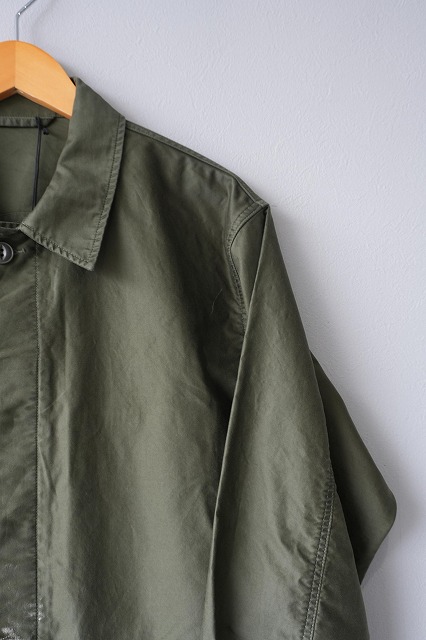 超長綿であるギザコットンを使用した光沢感と適度なしなやかさとドレープ性を持ち合わせた、綺麗なモールスキン素材は静岡県浜松市にて。仕上げには、信頼する凄腕の加工工場に依頼し、加工によるミリタリーライクな質感と生地が持つ高級感を共存させた一枚です。
