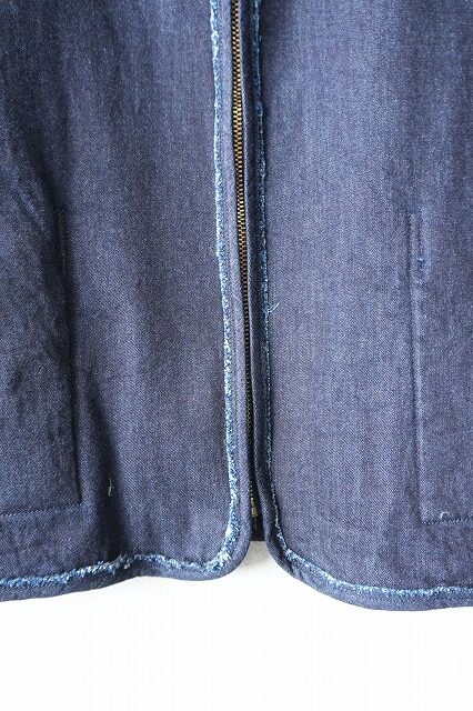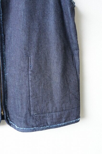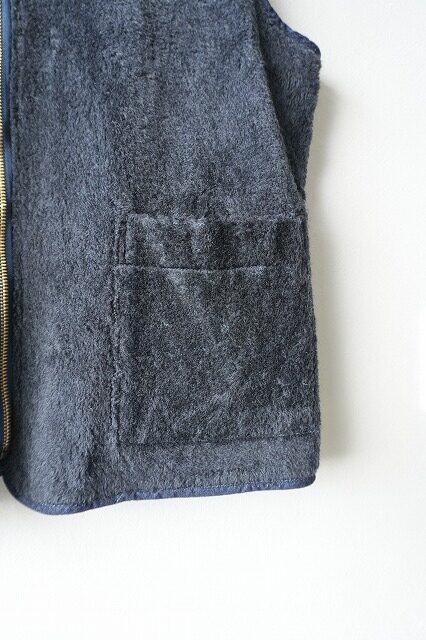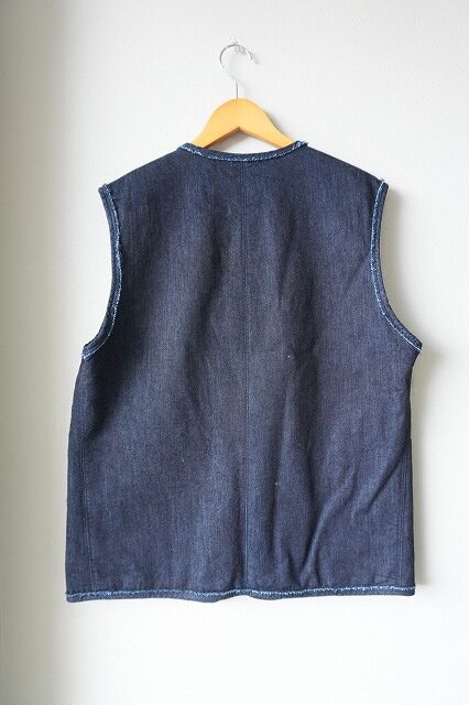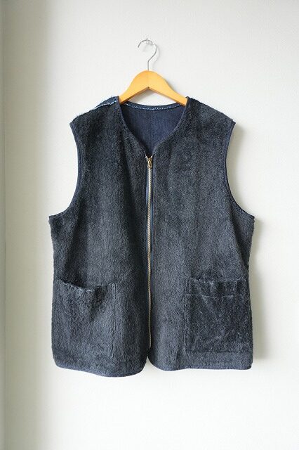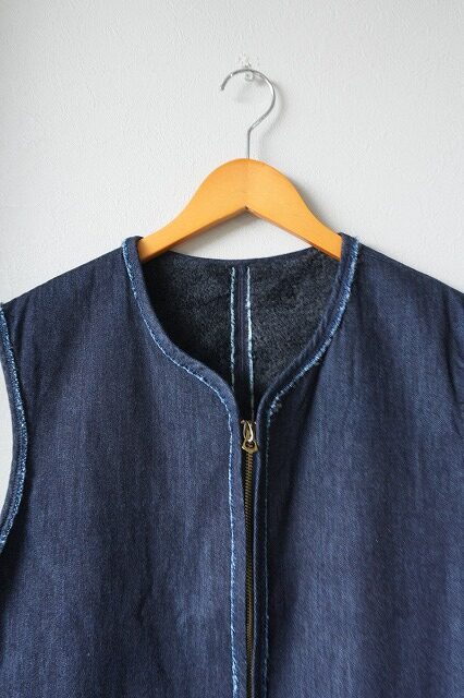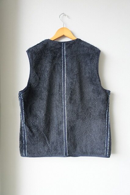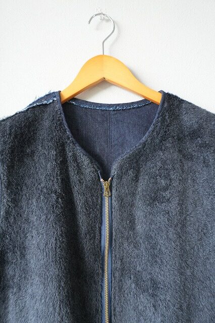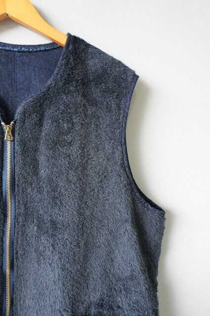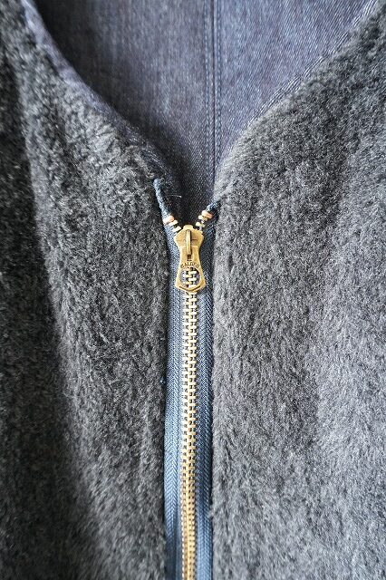 デニム面とボア面の2枚仕立てになる一般的(ビンテージも含め)なデニムボアベストとは違い、デニム地の裏面を直接ボア地した一重のデニムボア生地が特徴的です。