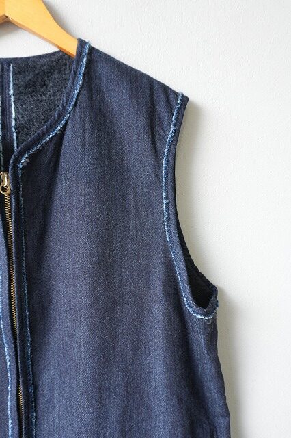 ビンテージボアベストをモチーフに、様々なシーン、スタイルで着ていただけるようにシンプルに仕上げています。リバーシブル仕様にしており、表(デニム)面はポケットも付けずスッキリとした面構え、裏(ボア)面は縫製部分を活かし配色になる様にデザインをしています。