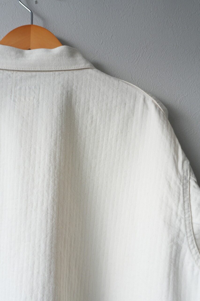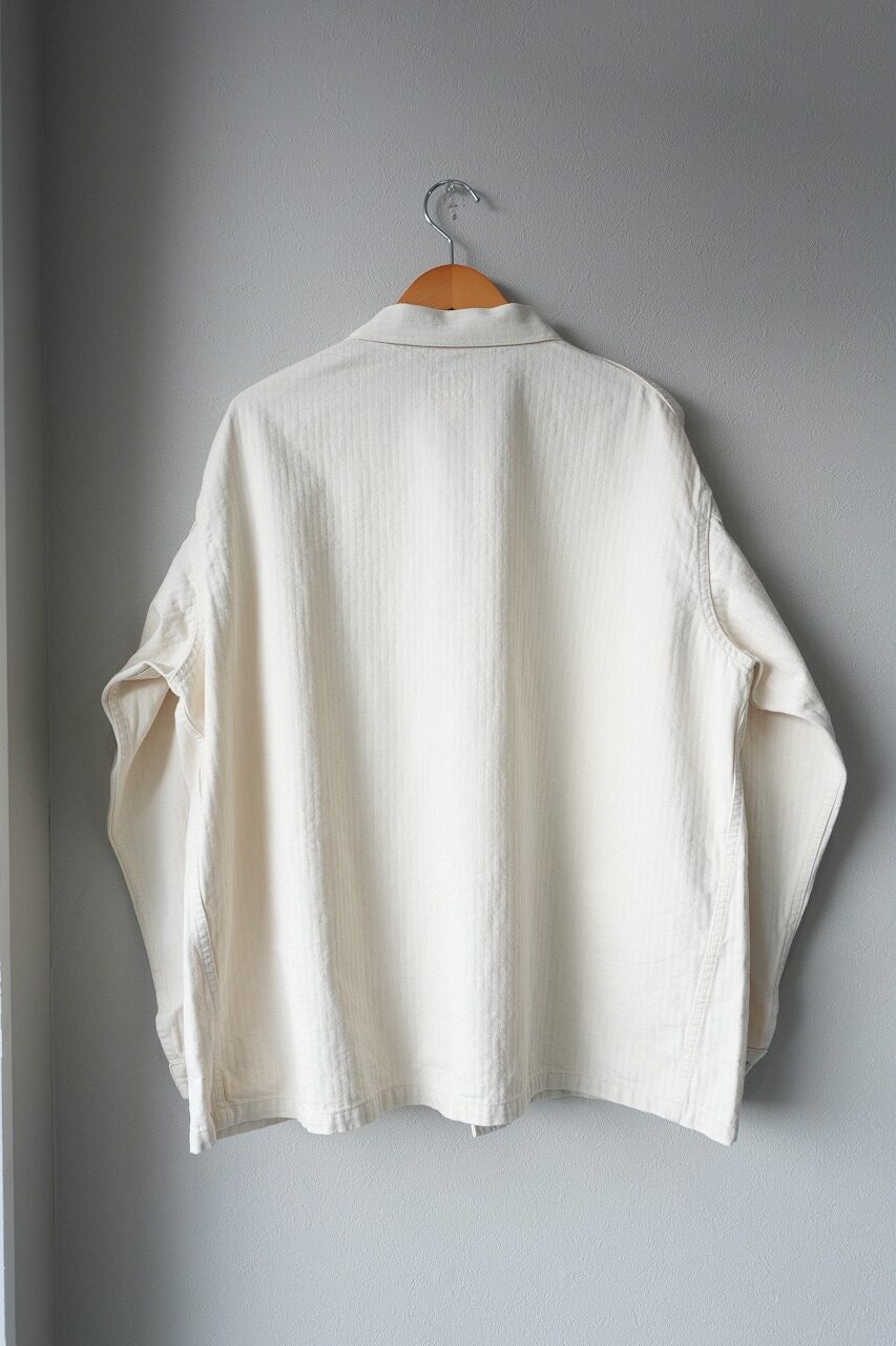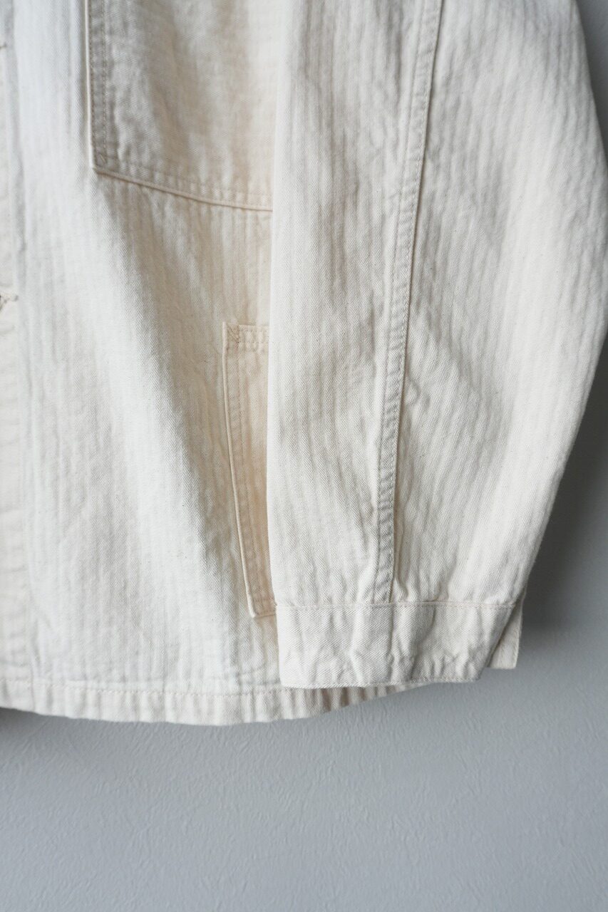 シンプルな3ポケット・デザイン、一番下のボタン以下が長いボタン配置、身幅が広く着丈の短いボックス・シルエット・・・今まさにタイムリーなカバーオールと言えるでしょう。