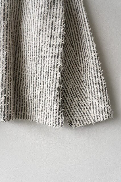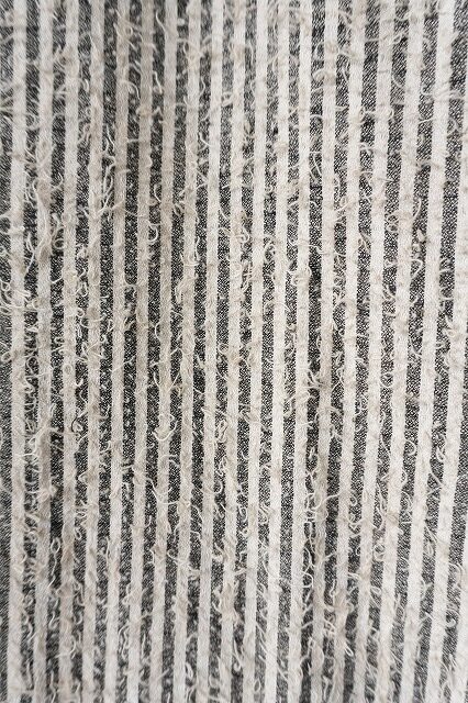 素材はコットン、リネン糸を使用し作られたストライプ、ギンガムチェック柄の生地に刺繍機を使い、生地全面に針を落とし緯糸を表に引き上げた、特殊加工を施した生地を制作。