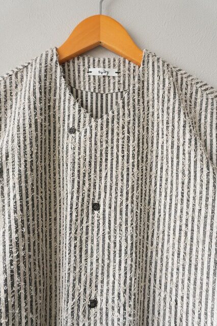 saby独自のスリーブデザインに加え、フロントはノーカラーですがトップボタンを外し襟を返して着用頂けるデザイン。