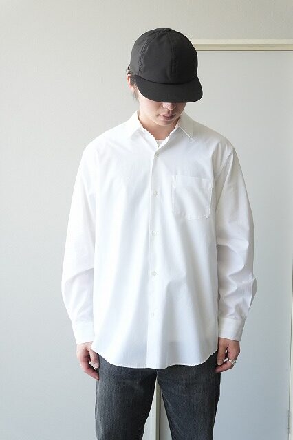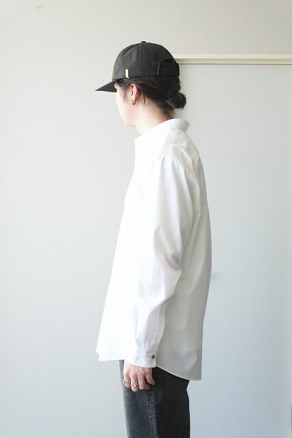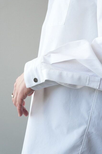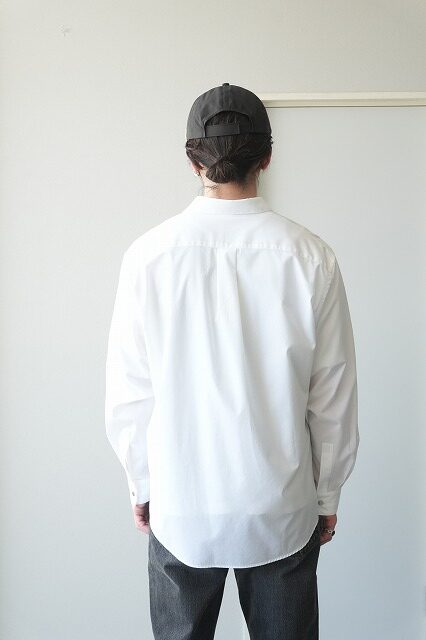 white と blueは、日本でも有数のシャツ生地産地である兵庫県播州地区で製作した、経糸、緯糸ともに100/2綿のポプリン。経糸には軽く、細くても強い糸を作る技術を用いており、シーズンを通して快適に着ていただける素材です。