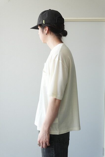コットンよりも通湿性と通気性に優れ汗を発散させるドライな肌触り、エレガントなドレープ感、暑い日常の贅沢品として着ていただける一枚。太番手にすると着心地が悪くなり、細番手過ぎるとボディーラインを拾ってしまい、艶が出てしまうので程よい肉感に仕上げています。