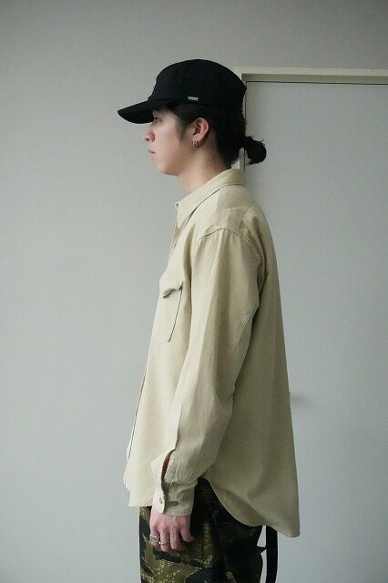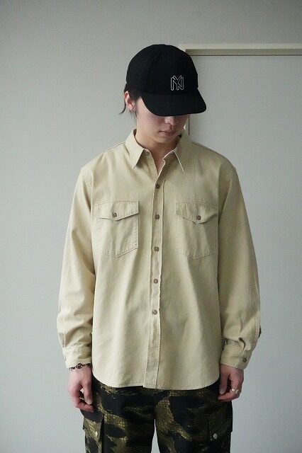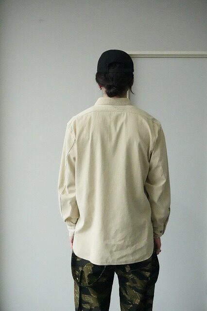 WORKADAY SHIRT PMAV-LS04-SAND BEIGE(FADED) 6oz のデニム生地を使用し全体的に加工をほどこしたデニムワークシャツ。 全体的にフェードした見え感ですが、運針の細かさ等、どことなく ビンテージのドレスシャツを思わせる品のある仕上がりが魅力の アイテムです。 サイズ 2 着丈 76cm 身幅 59.5cm 袖丈 60cm 肩幅 49cm サイズ 3 着丈 79cm 身幅 61.5cm 袖丈 61cm 肩幅 50cm 素材 コットン100% 着用サイズ 3 175cm 67kg PHIGVEL MAKERS Co.【フィグベル】 カラー SAND BEIGE(FADED) サイズ 2 3 在庫状態 : 売り切れ ¥41,800(税込) 只今お取扱い出来ません 数量
