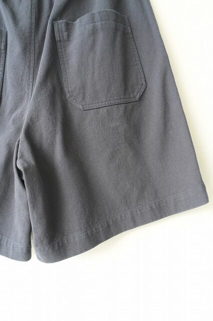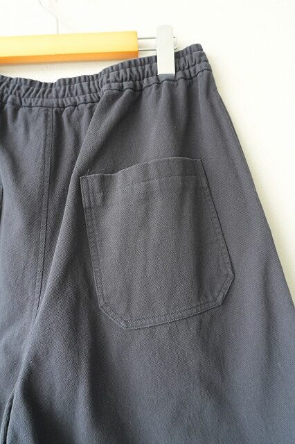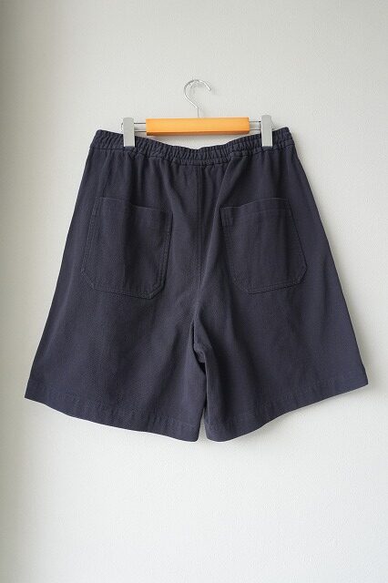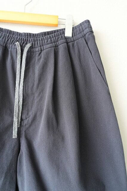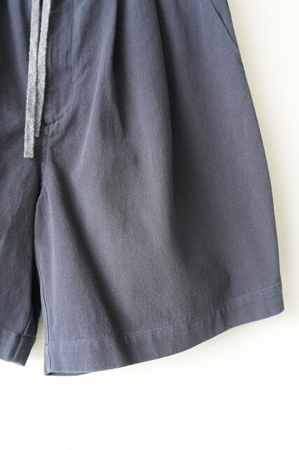 裾幅をかなり広く取ることで非常に通気性の高い2タックのイージーショーツ。外側に紐が出るドローストリング仕様なので、トップスをタックインした際に良いアクセントになります。茹だる様な暑い夏に穿けるように”肌離れの良い”強燃のコットンツイルが快適です。