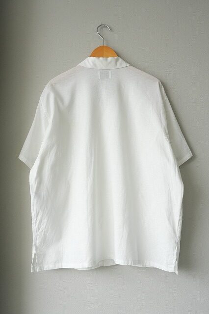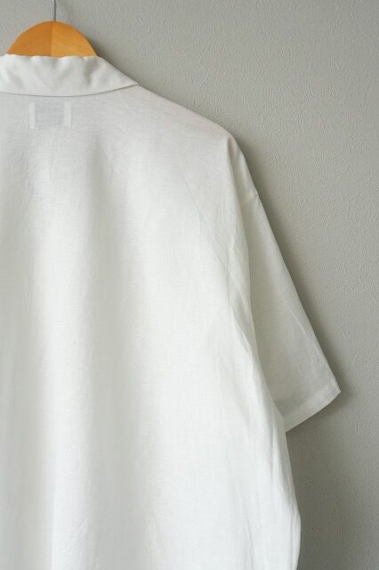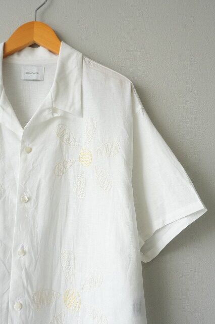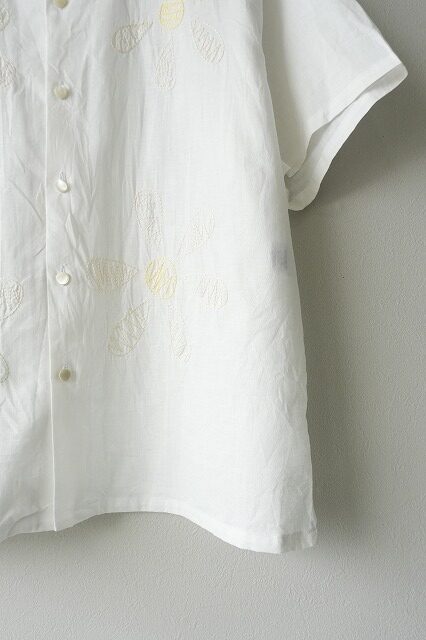 綿麻の薄手のポプリン素材に大胆な手書き風の花柄を刺繍したオープンカラーシャツです。